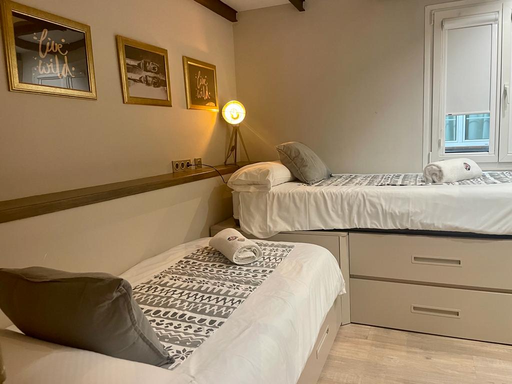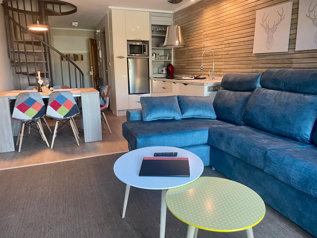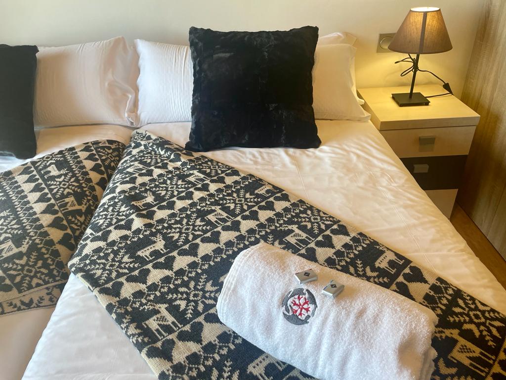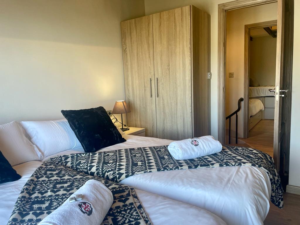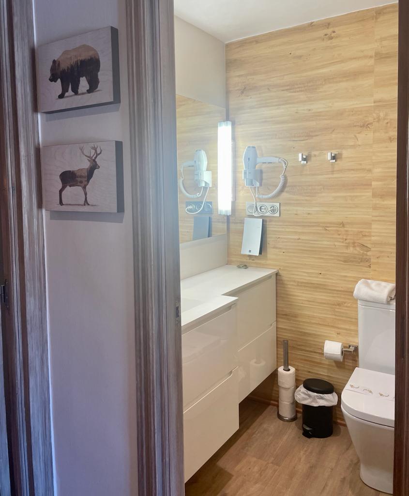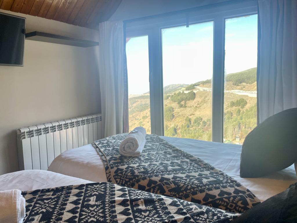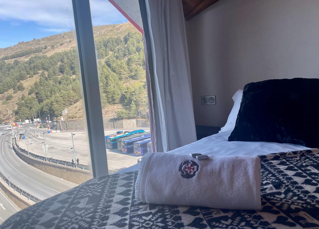 Uno de los apartamentos mas amplios de la sierra compuesto una entrada con gran armario y guarda esquís, un salón cocina con diseño moderno y un espectacular ventanal en su planta baja y una habitación principal con espectaculares vistas además de otra habitación de dos alturas en la que pueden instalarse 4 personas de forma cómoda en colchones independientes de 90 cm.