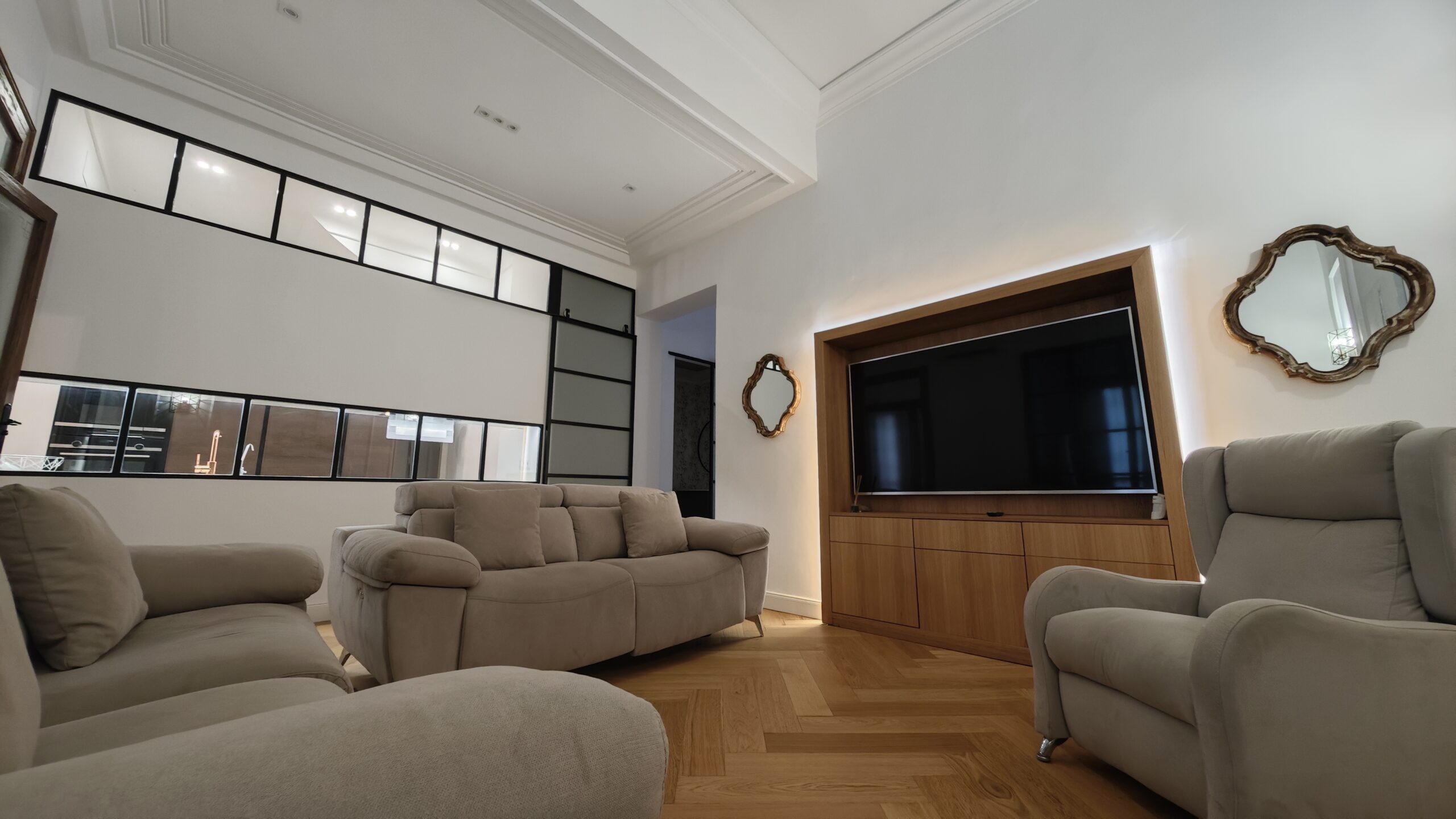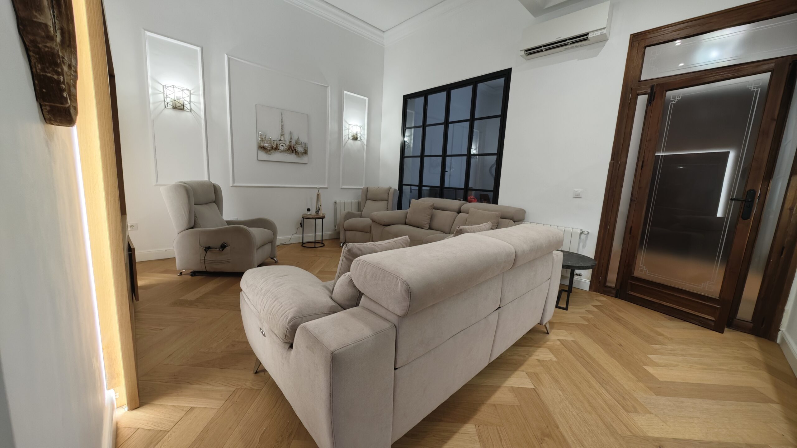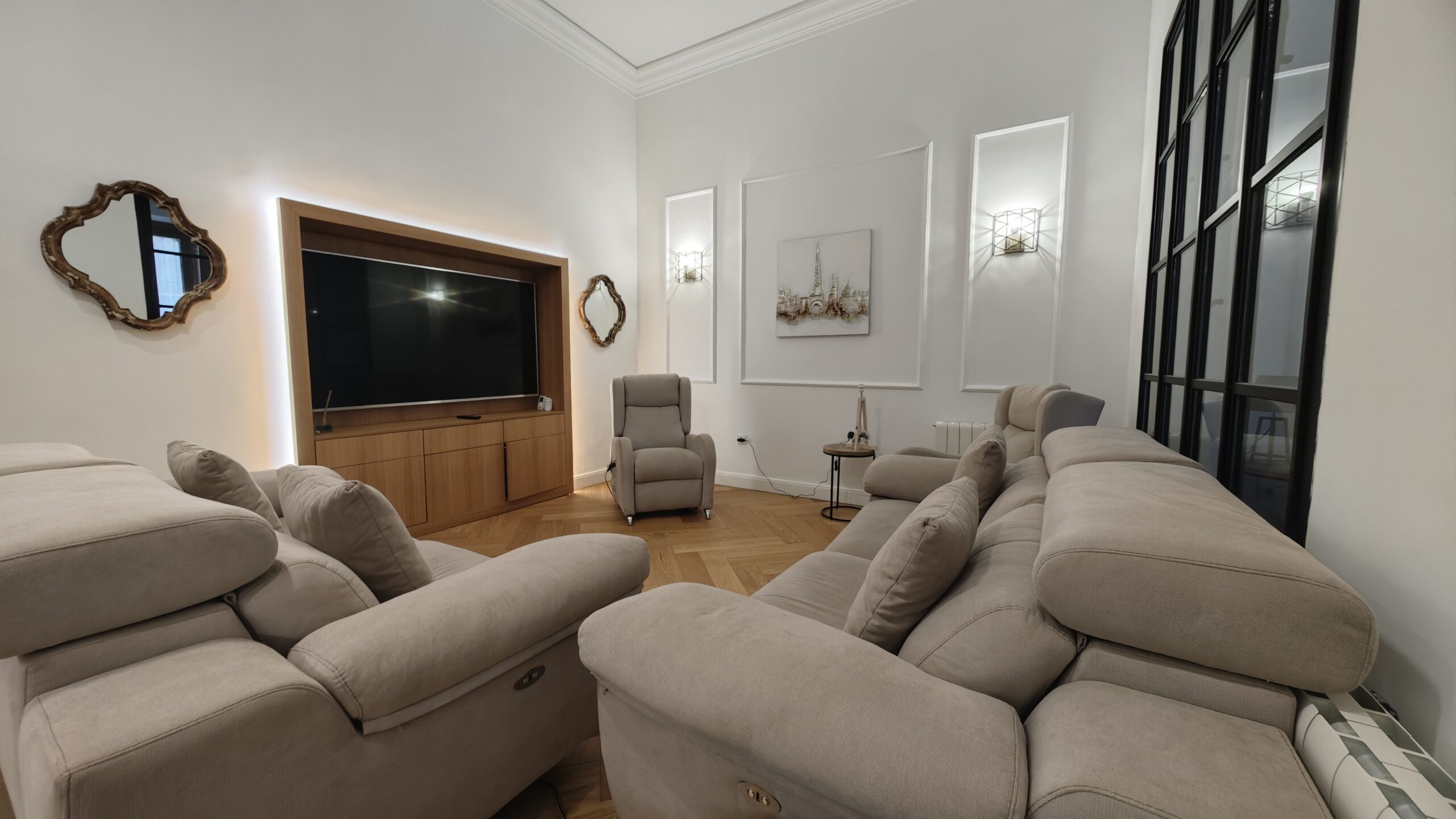 El salón exquisitamete decorado, tiene un televisor de gran formato de 75 pulgadas, dos cómodos sofás y dos sillones, toda esta tapicería con motores para conseguir el descanso y relajación perfectos.