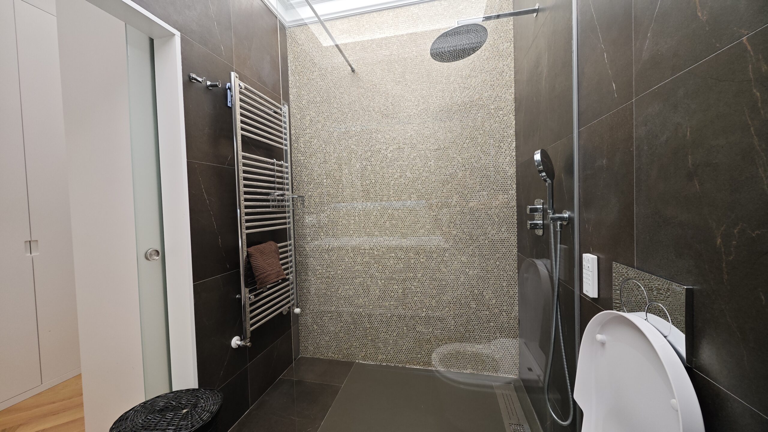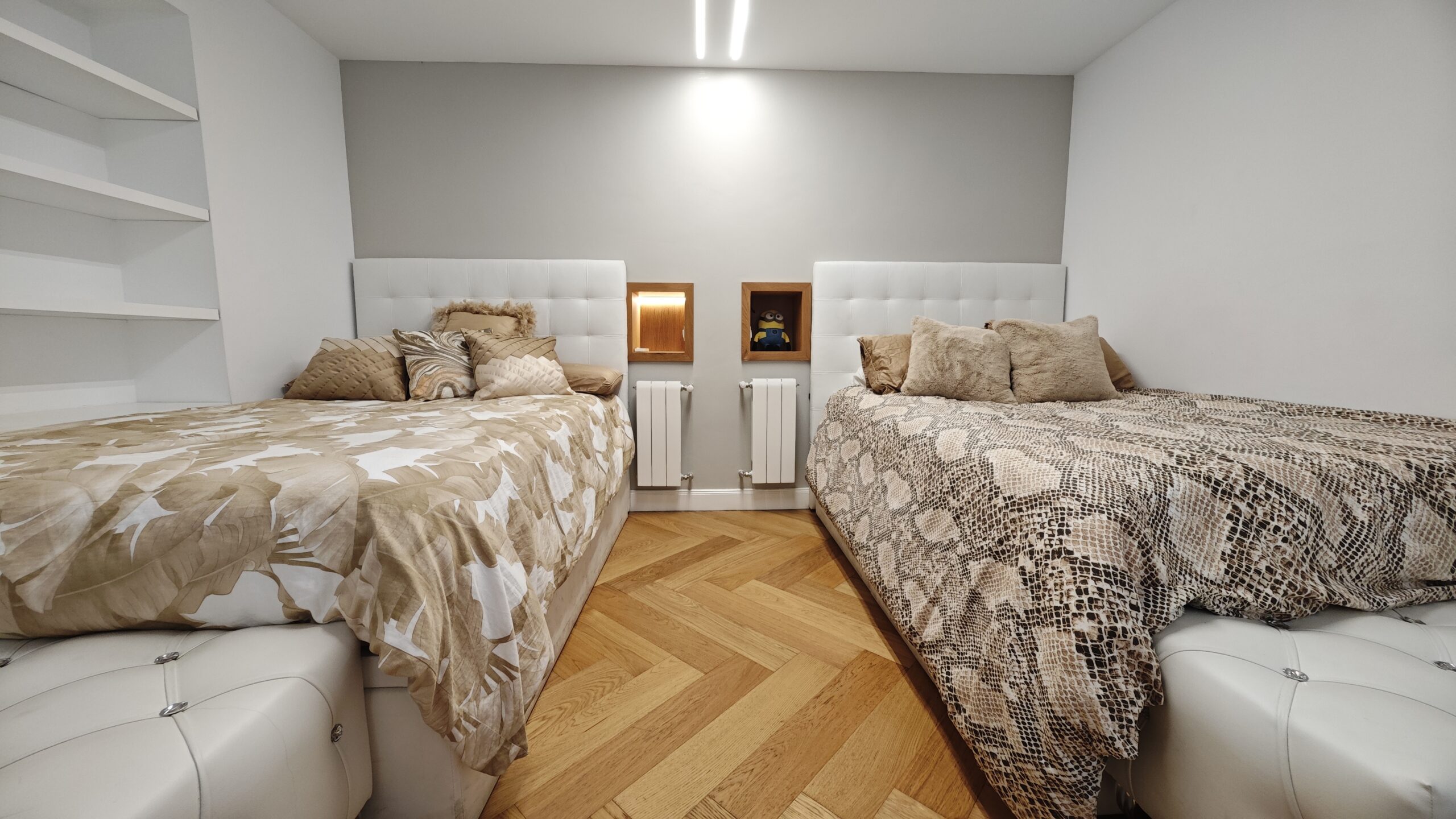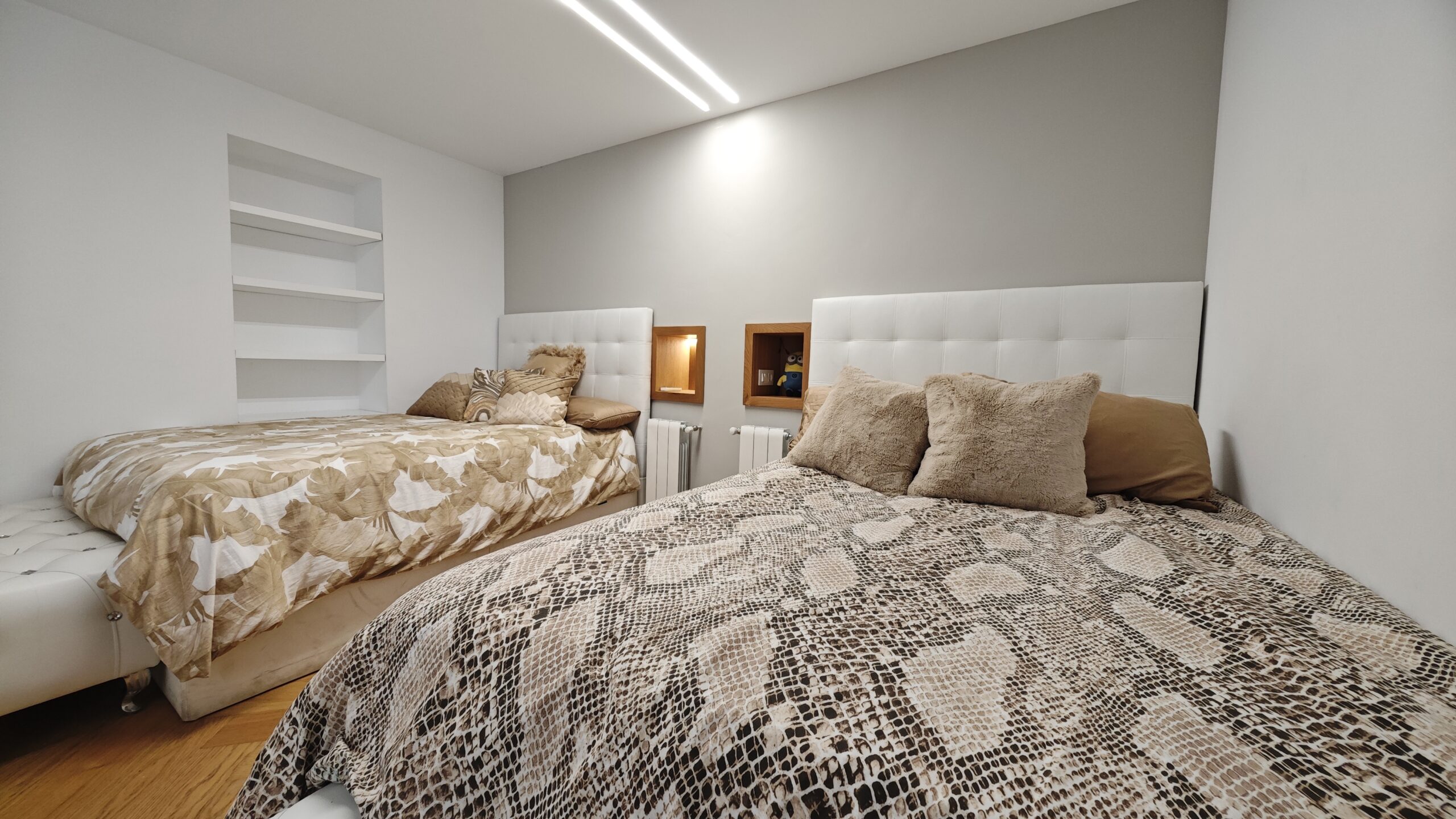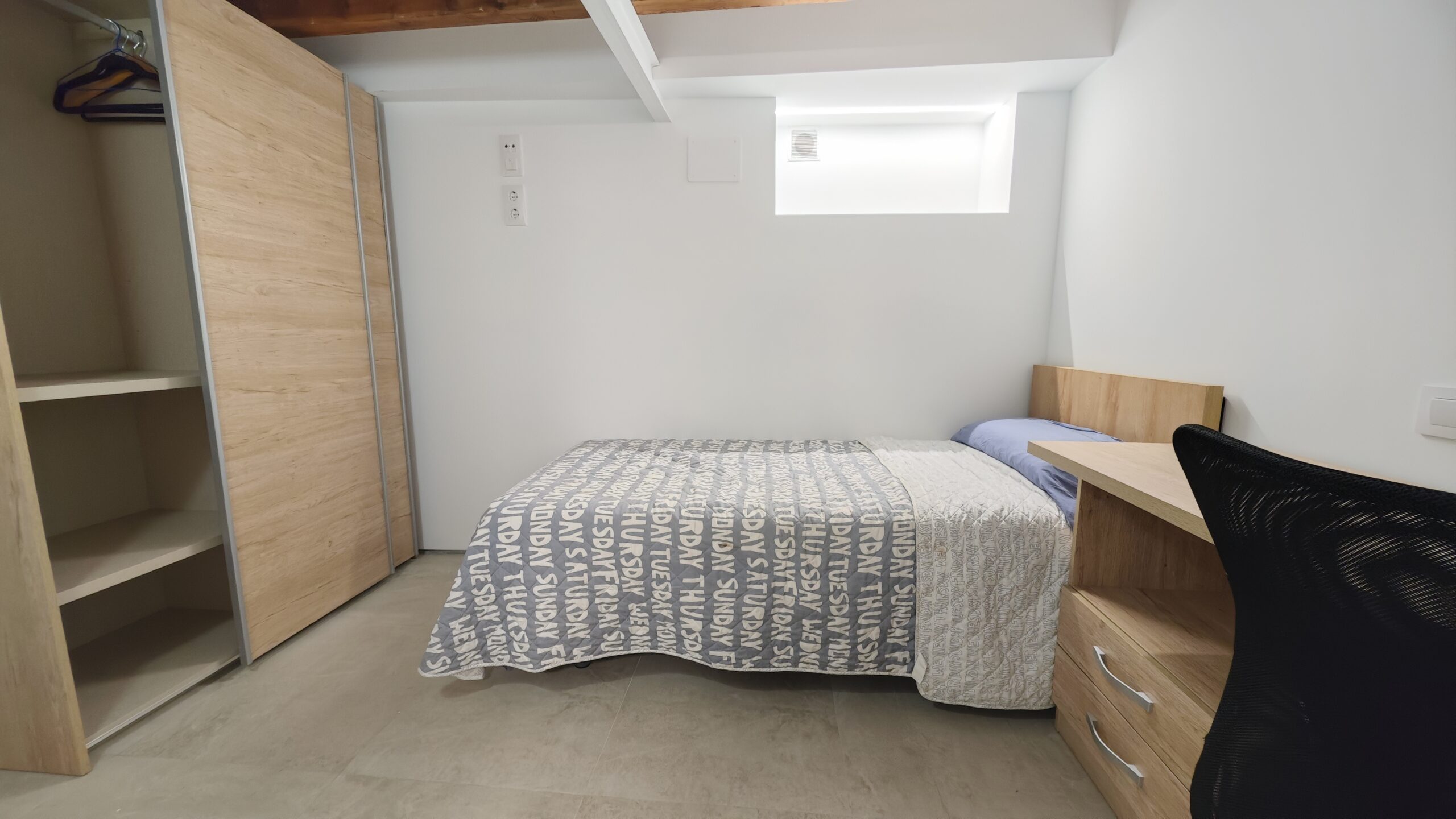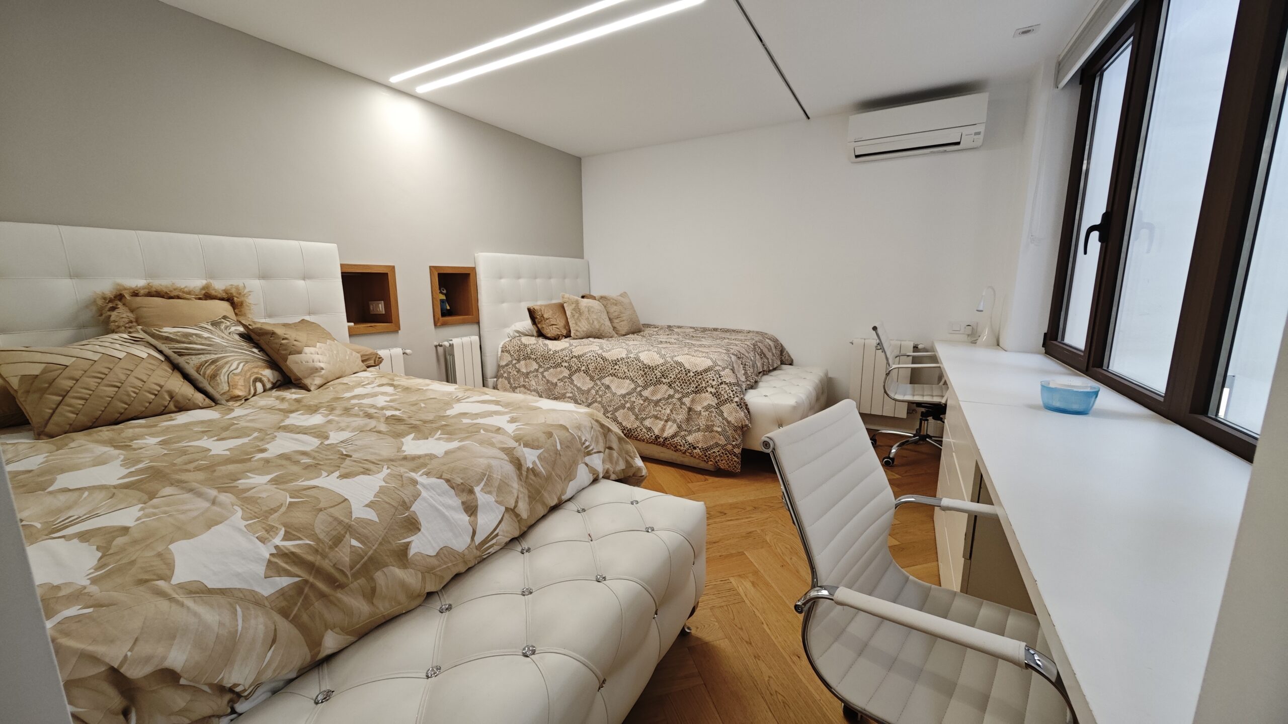 Consta de dos amplias habitaciones, una juvenil con dos camas de 150 cm, mesa de estudio frente a la ventana , amplio vestidos y aseo completo suite con taza japonesa. La habitación principal contra de una cama de 180 cm y armarios empotrados desde el suelo hasta el techo y un aseo completo recubierto de mármol y taza japonesa. Existe otra habitación juvenil en el sótano con su propio baño con ducha.